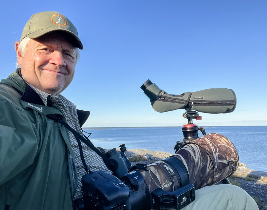 Jon Helle i sitt rette element, med kikkert, teleskop og kamera på ytterste kyst i Trøndelag. Foto: Jon Helle